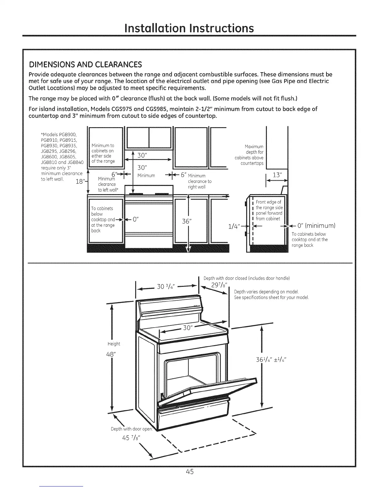 Provide adequate clearances between the range and adjacent combustible surfaces. These dimensions must be
