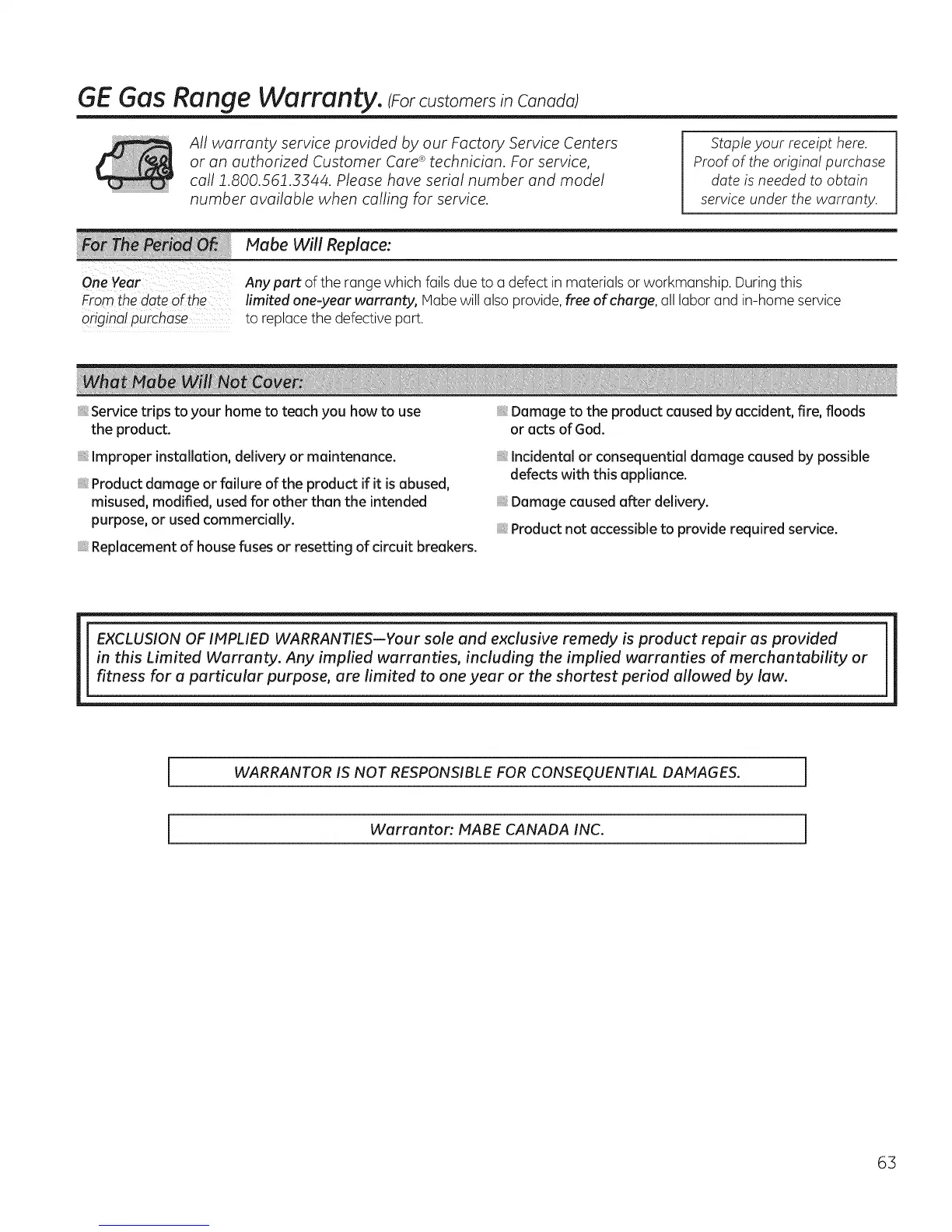 limited one:year warranty, Mabe will also provide, free of charge, all labor and in-home service