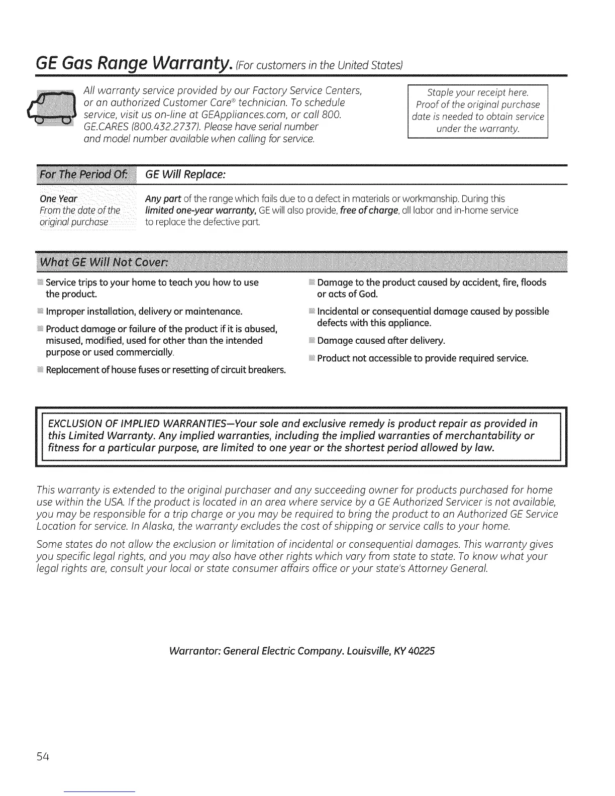 GE Gas Range Warranty. cForcustomersintheUnitedStates)