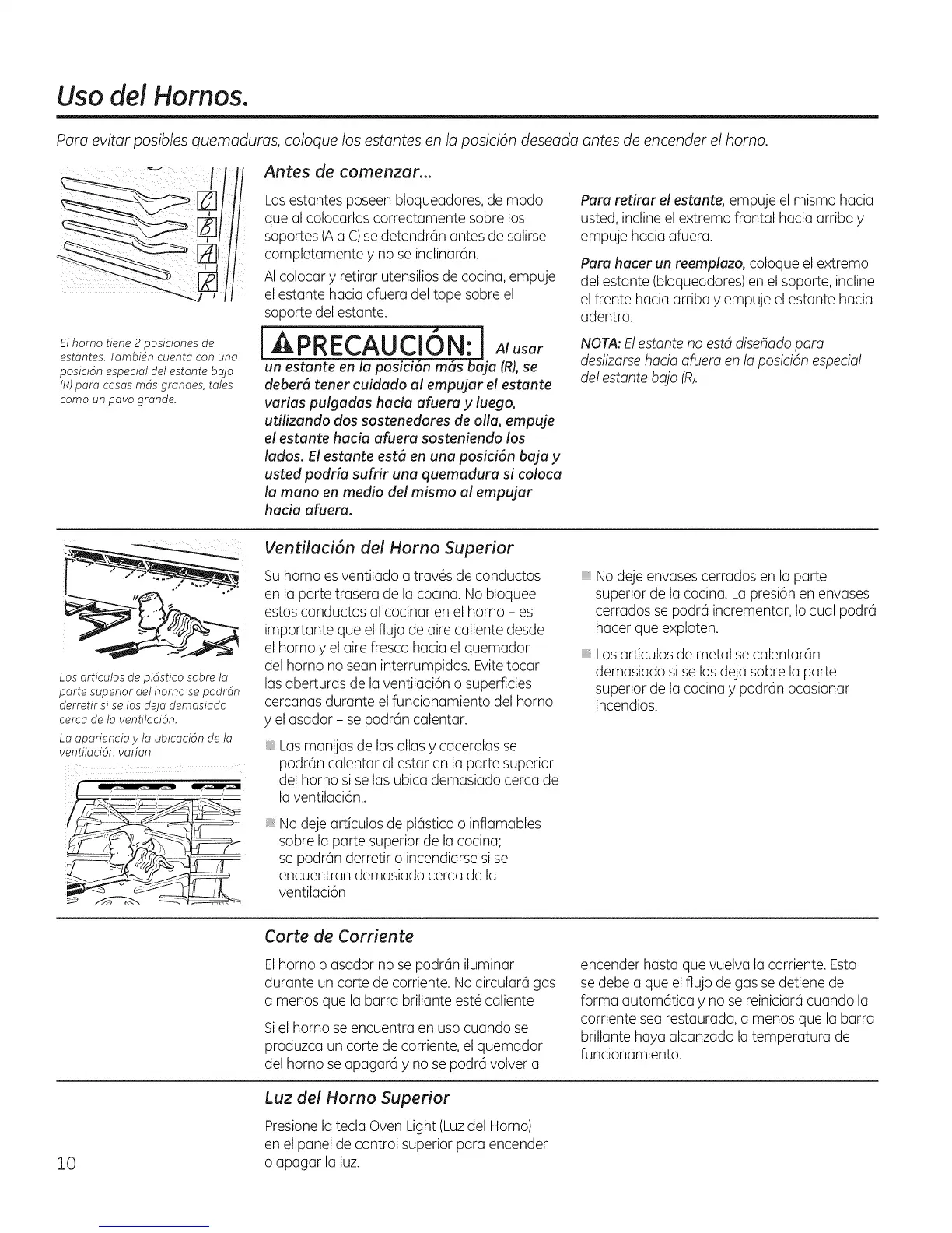 Para evitar posibles quemaduras, coloque los estantes en la posici6n deseada antes de encender el homo.