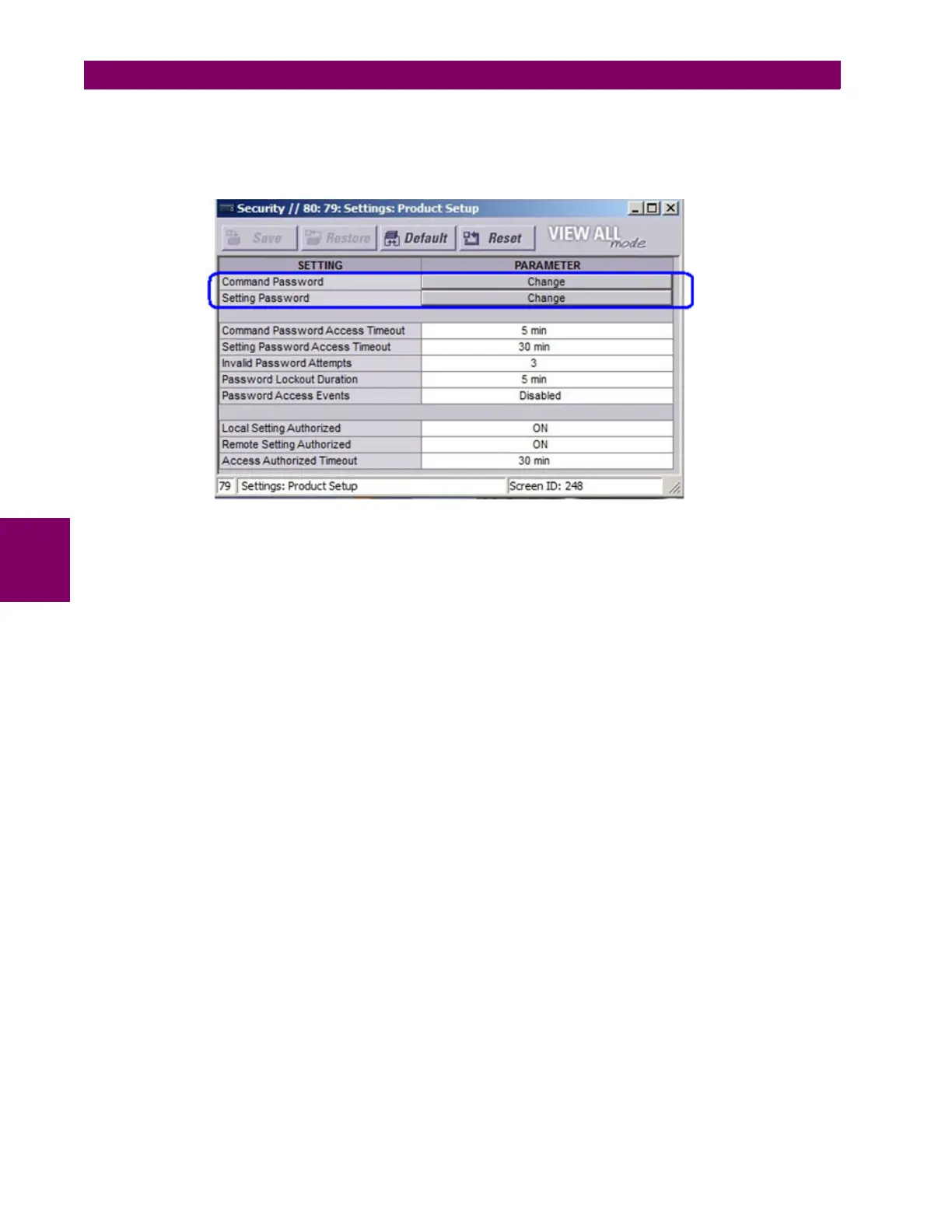 The following settings are available through the remote (EnerVista UR Setup) interface only. Select the Settings > Product