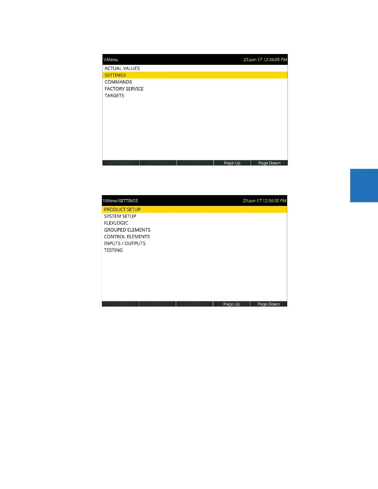 Use the Up or Down pushbutton to select SETTINGS, then press the Right or ENTER pushbutton.