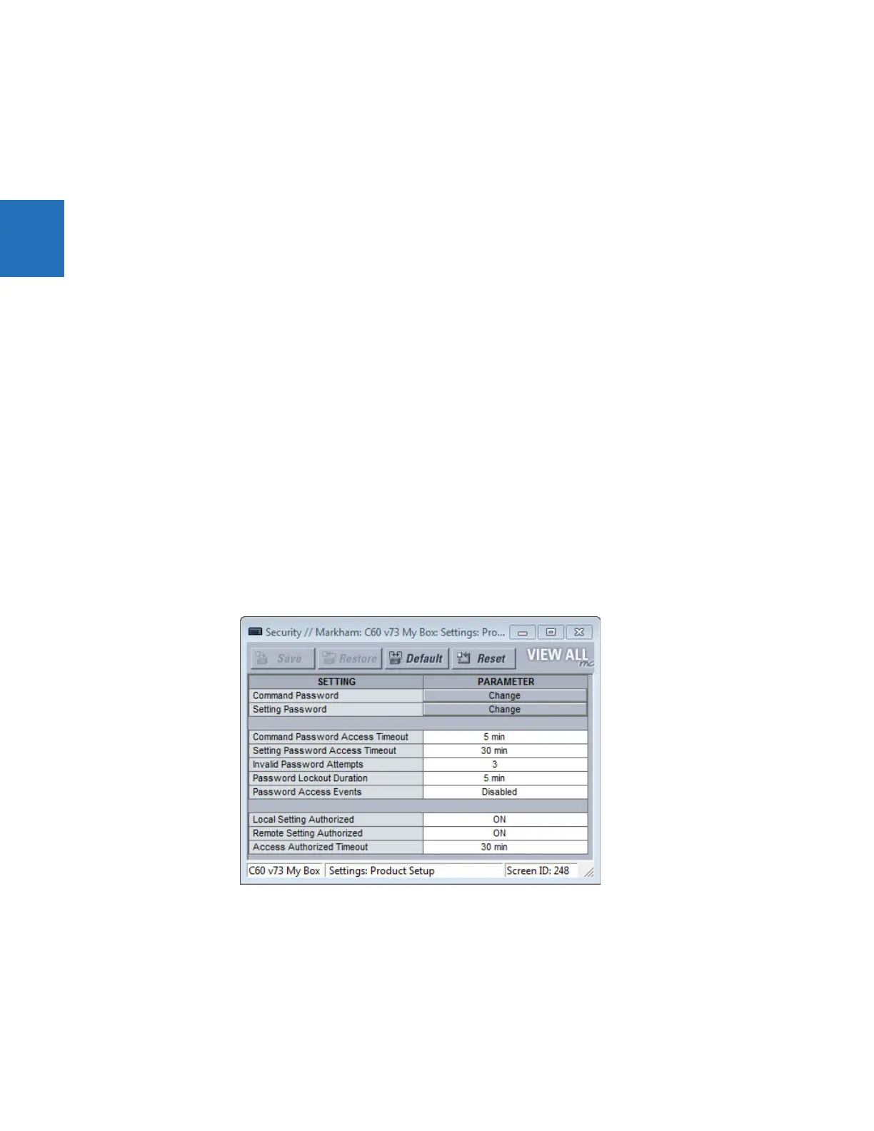 Two levels of password security are provided: command and setting. Use of a password for each level controls whether all