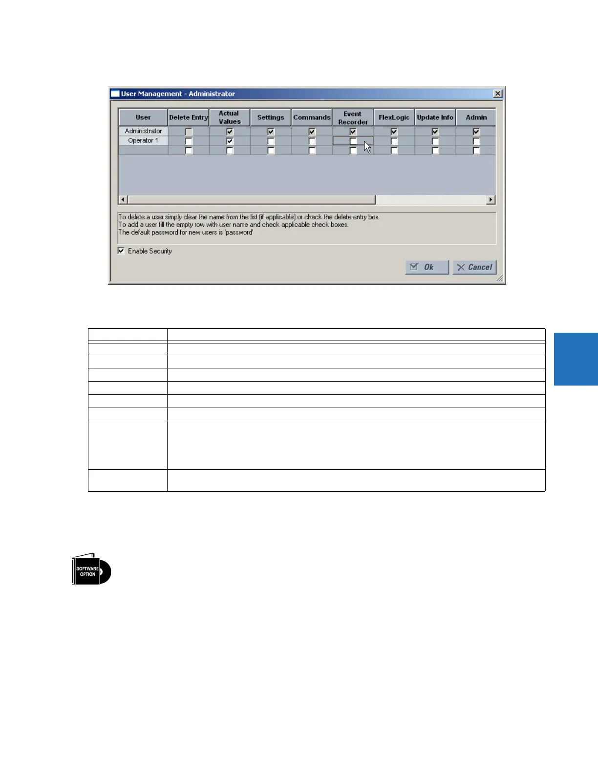 Recorder, and FlexLogic check boxes are enabled by themselves, the user is granted read access. When