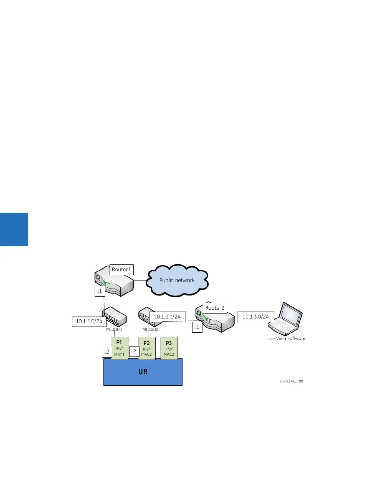 • Port 2 (IP address 10.1.2.2) connects the UR to LAN 10.1.2.0/24 and to the EnerVista software through Router2. Router2