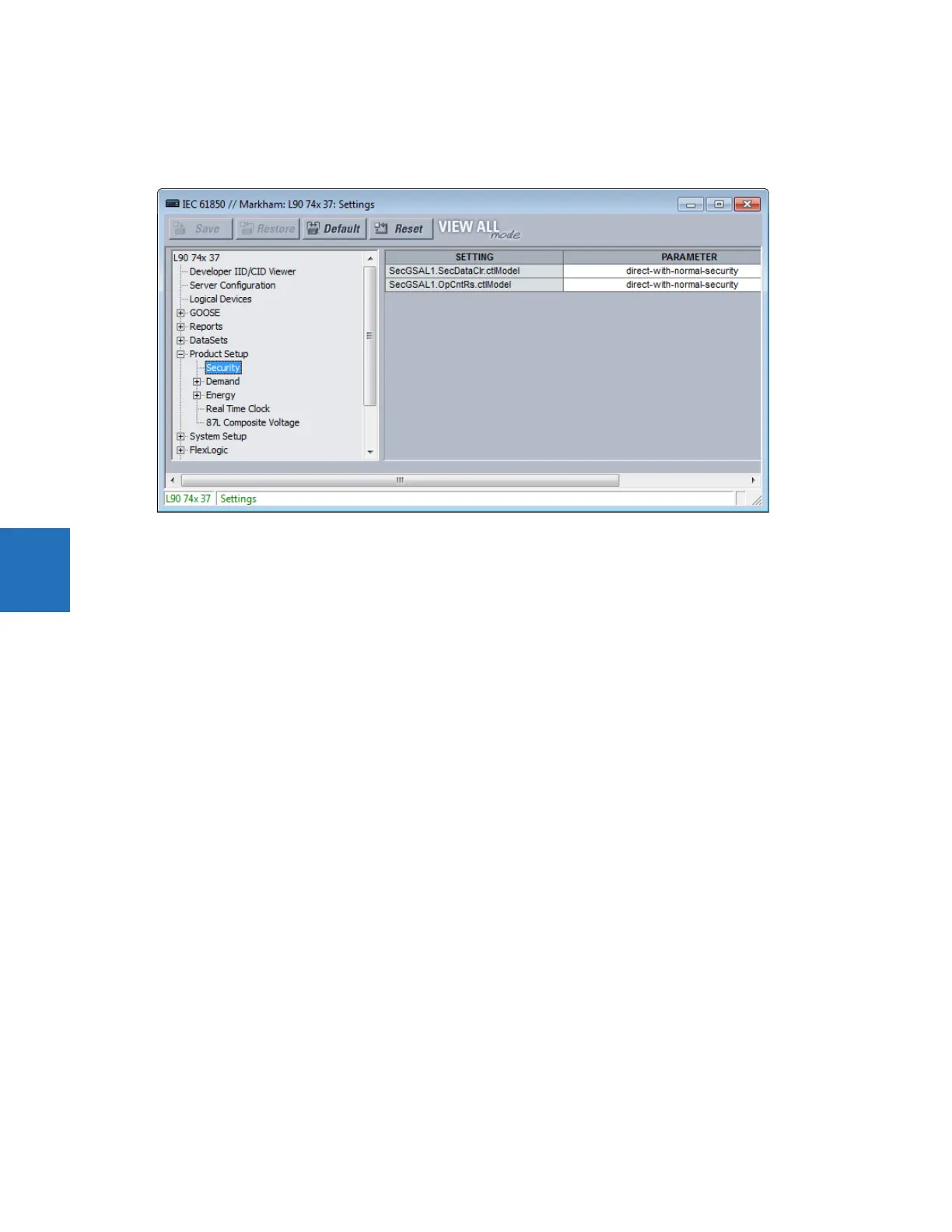Navigate to Settings > Product Setup > Communications > IEC 61850 > Product Setup > Security.