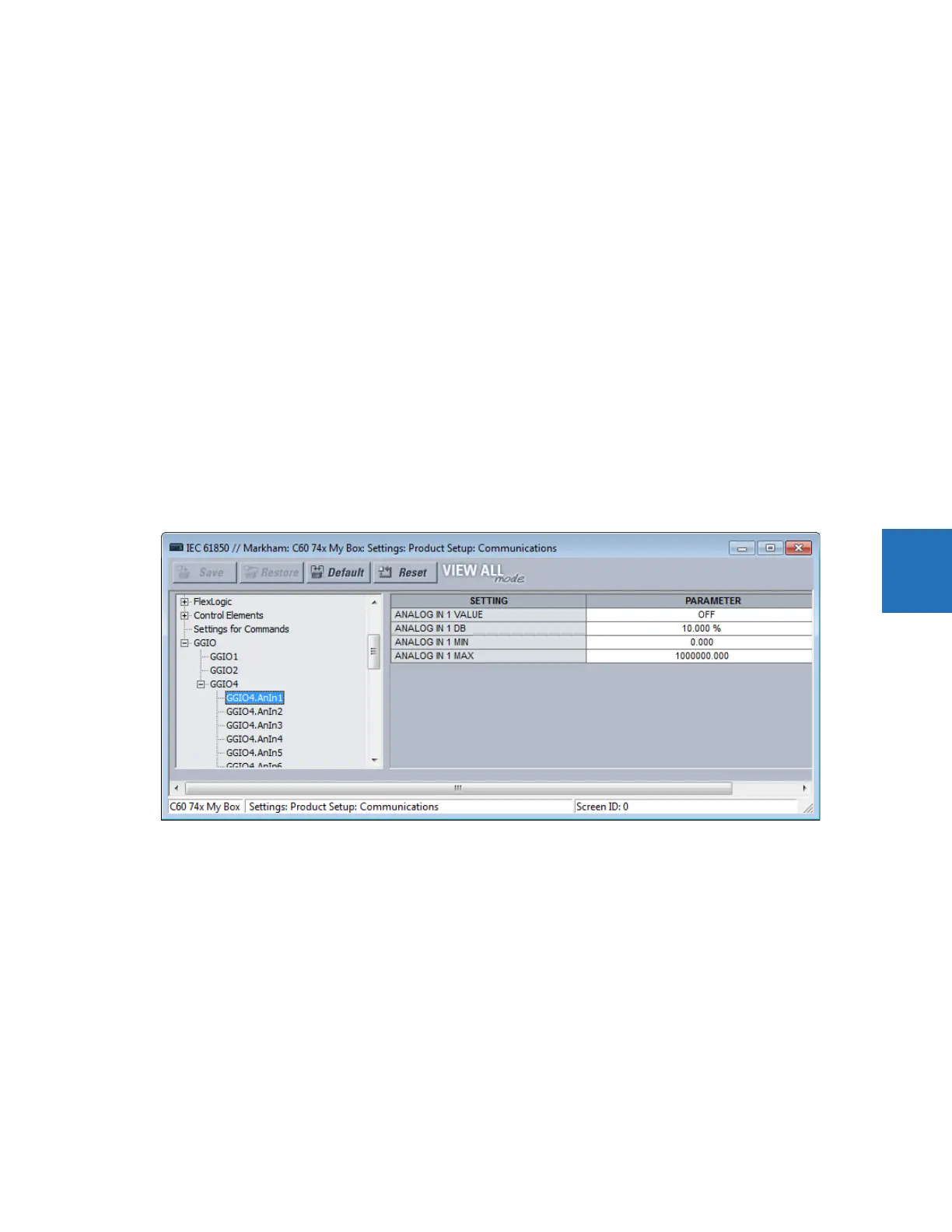 Navigate to Settings > Product Setup > Communications > IEC 61850 > GGIO > GGIO4 > GGIO4.AnIn1 to access the