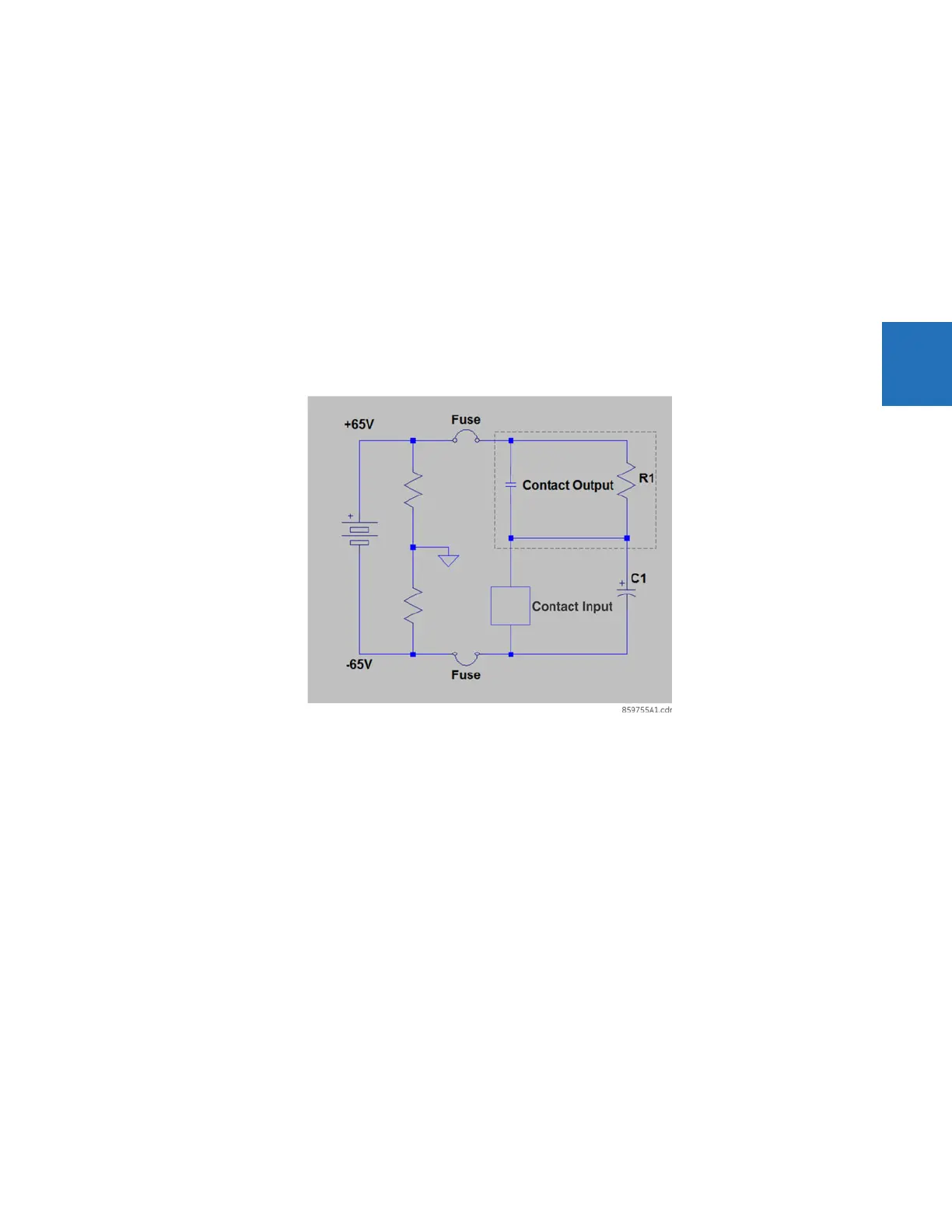The following figure shows a typical DC circuit, with battery ground detection, of contact input. The contact output has