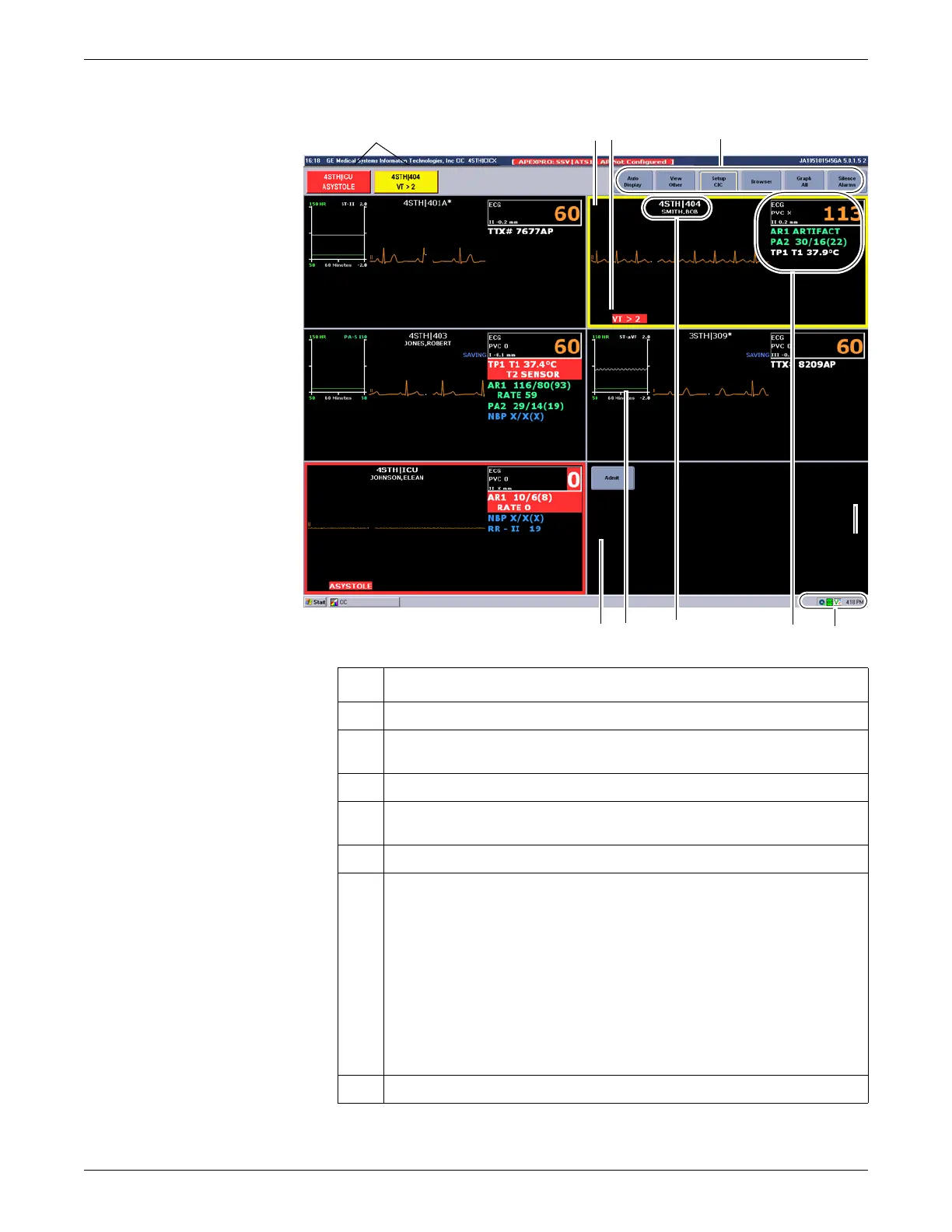 1 Alarm buttons. Show the care unit name, bed number, and the cause of the alarm.