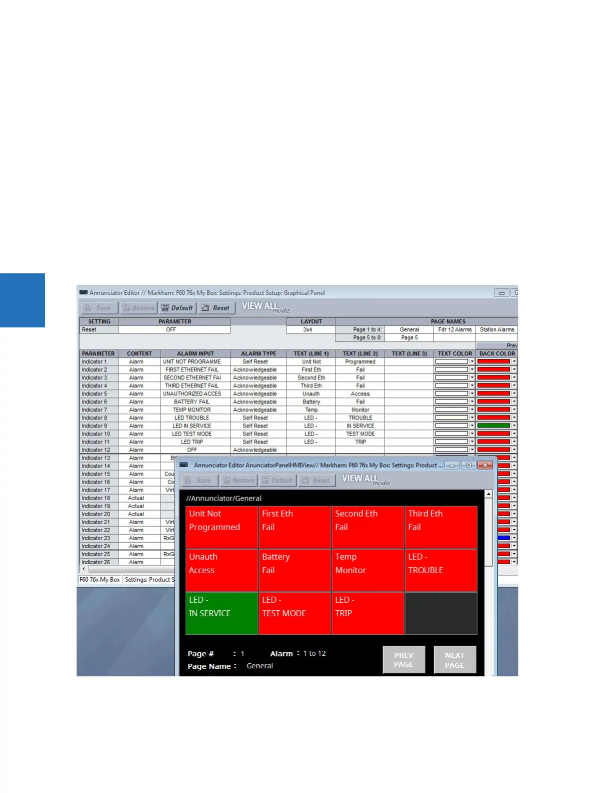 The figure shows the annunciator editor and its preview window. The page name is entered as General at the top right.