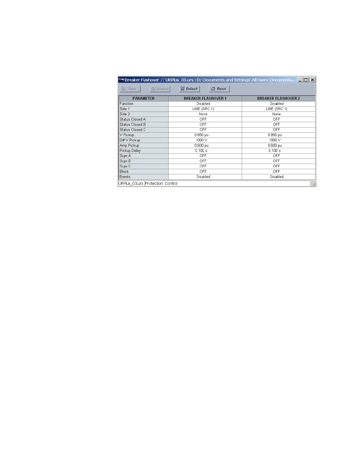 Select the Settings > Protection > Control > Breaker Flashover menu to open the breaker
