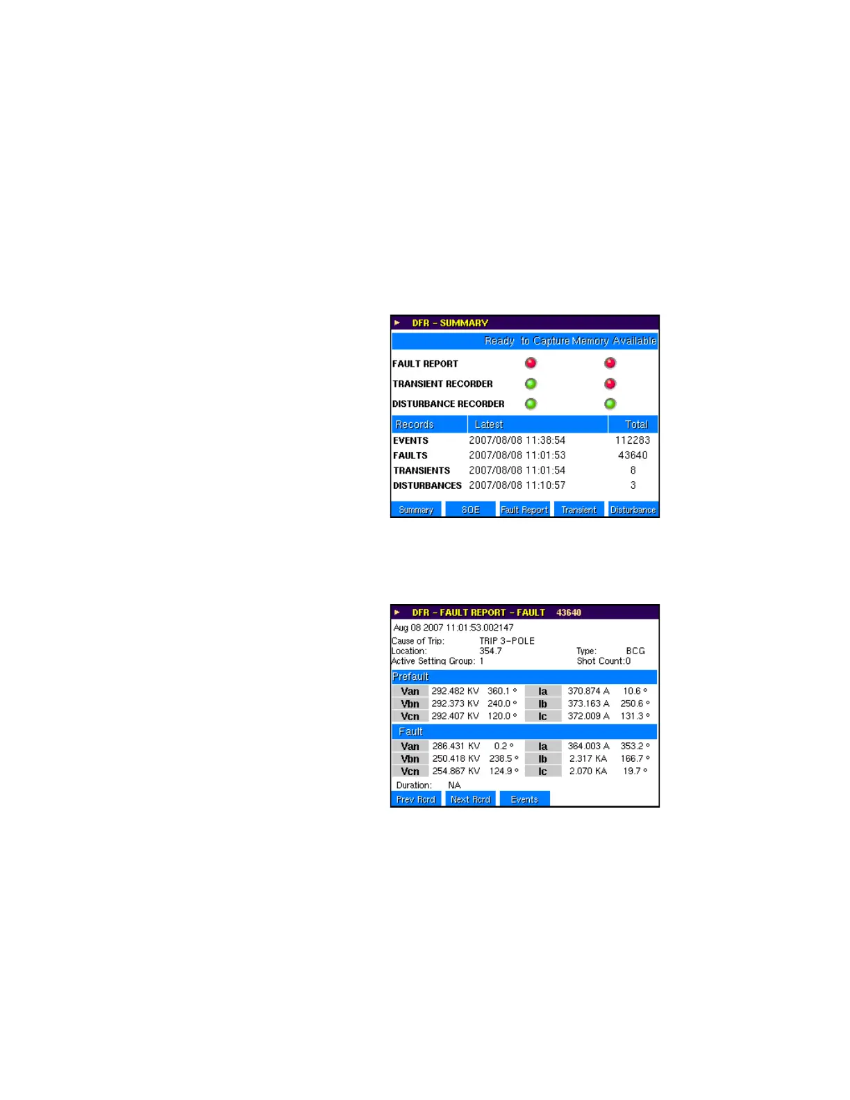 fault and prefault current and voltage data, as well as the cause of trip, trip type, active