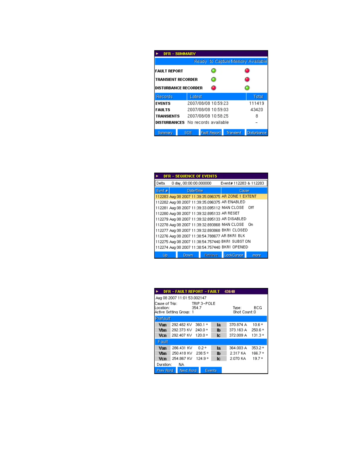The digital fault recorder menu transient record menu lists all of the records currently