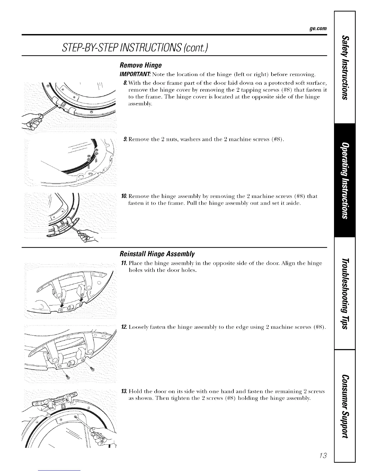 12. I,ooselx fasten tile hinge assembly to tile edge using 2 machine screws (#8).