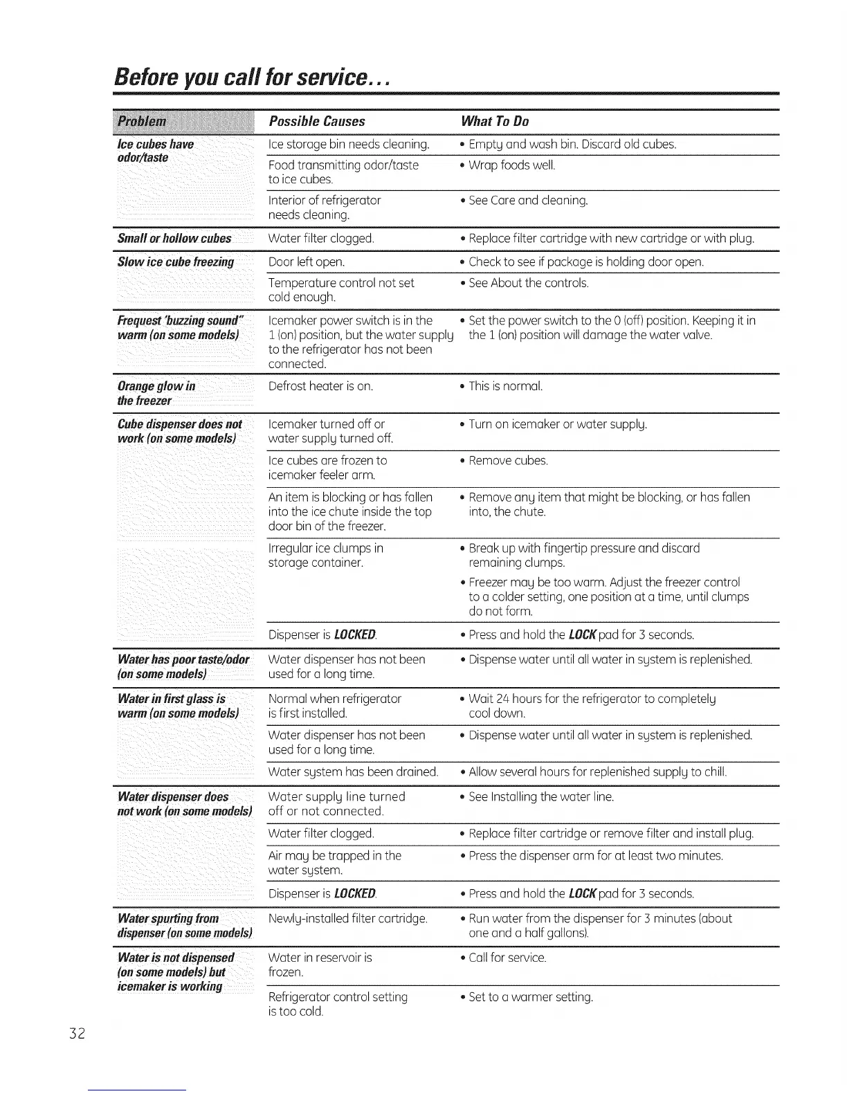 Waterhaspoortaste/odor Water dispenser has not been * Dispensewater until all water in sgstem is replenished.