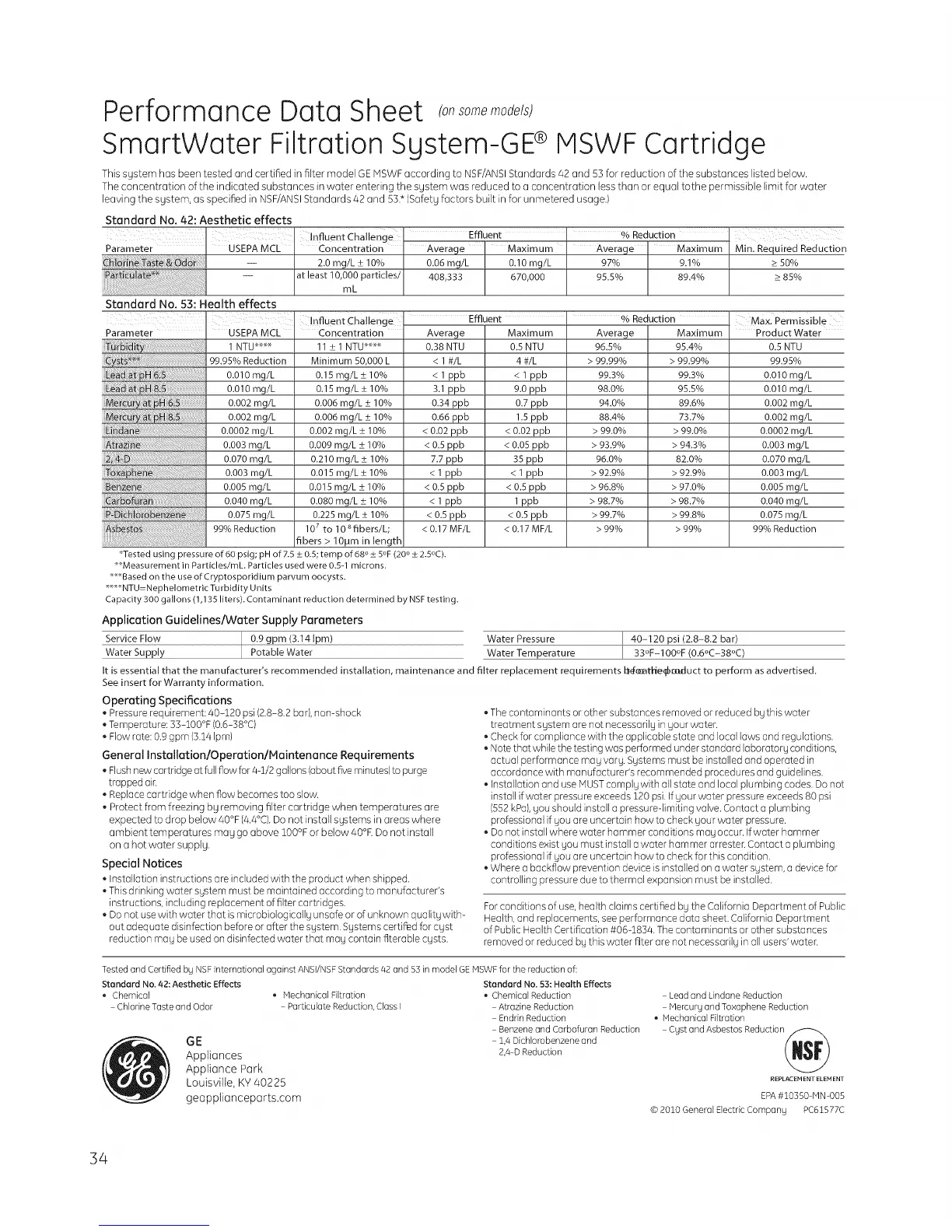 This sgstem has been tested and certified in filter model GE MSWF according to NSF/ANSI Standards 42 and 53 for reduction of the substances listed below.