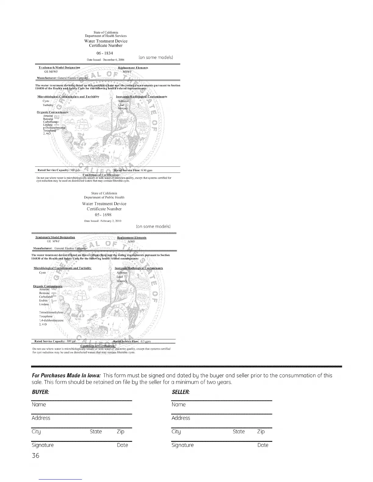 "lhe _ater treatment dcv_ce/s) l_sted on this cel_til]e_t e _'4e reel tile testing requh'emenrs pursuant to Suction