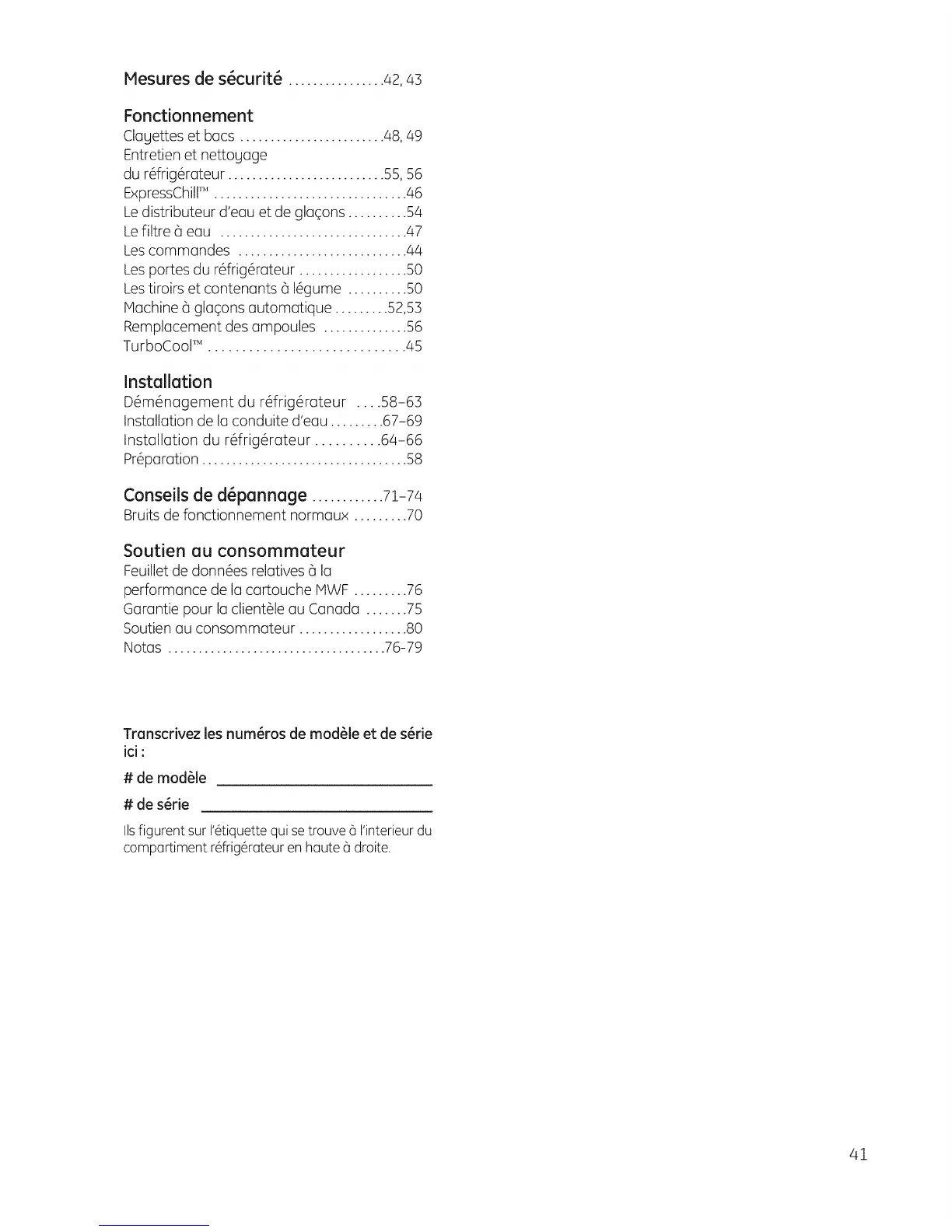 Installation du r#frig@ateur .......... 64-66