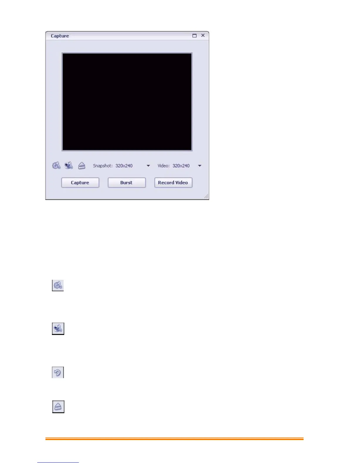 by clicking the "Burst" button. Capture a video clip by clicking "Record Video" and then "Stop