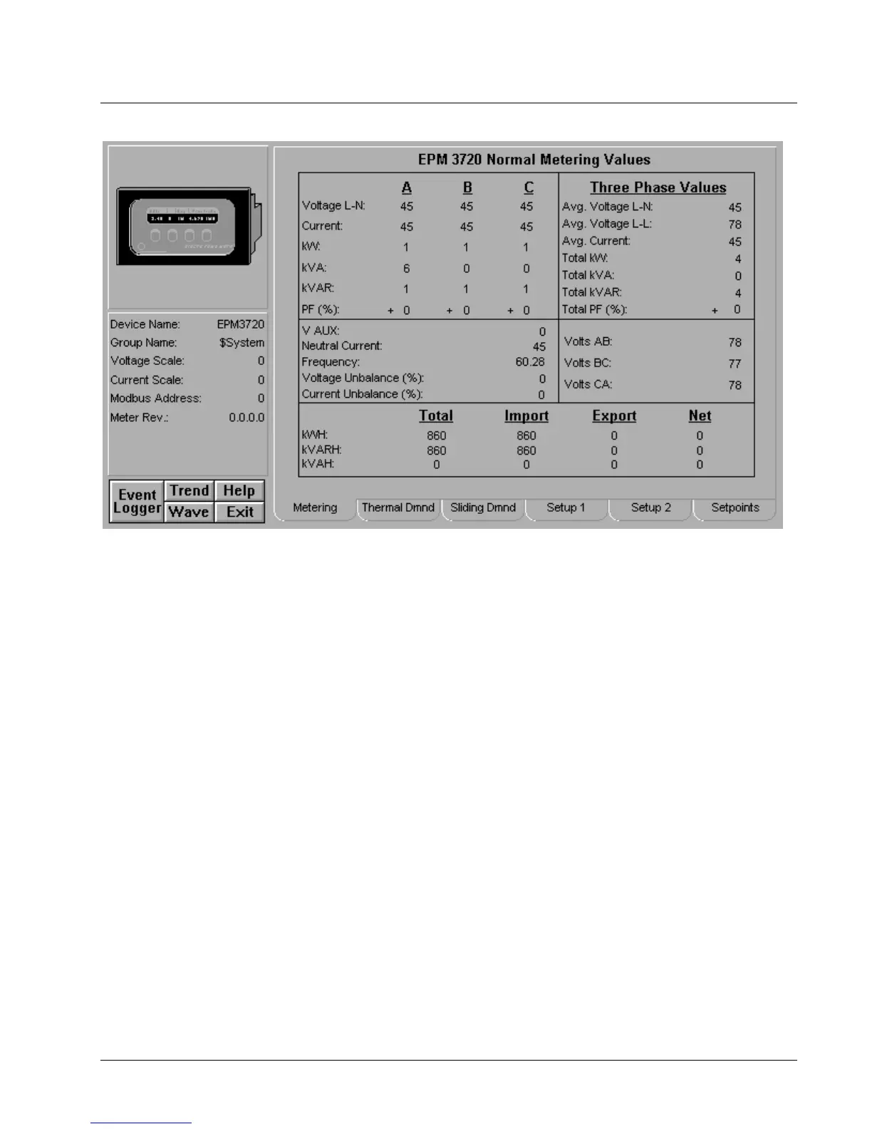 When you first open the EPM 3720 Tabular Data Screen, you may see values of zero