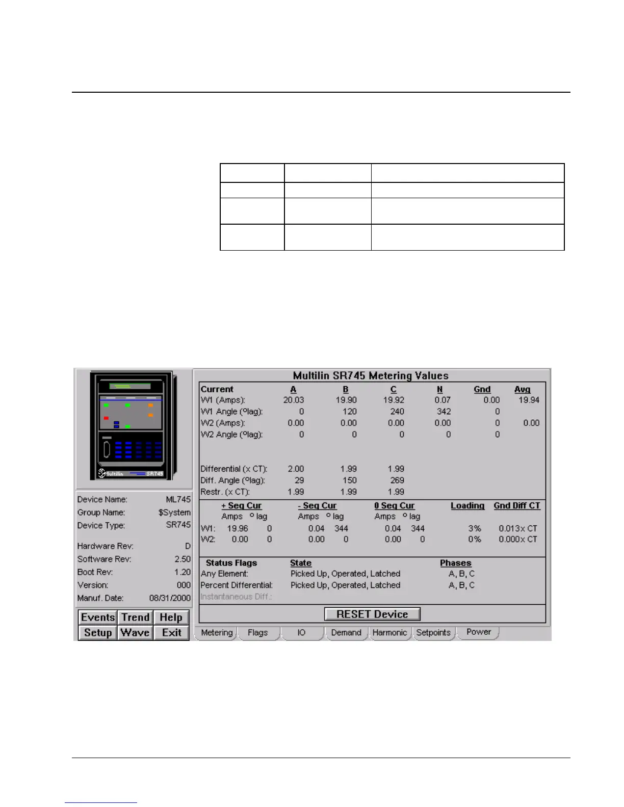 The Multilin SR745 Metering Values screen shows: