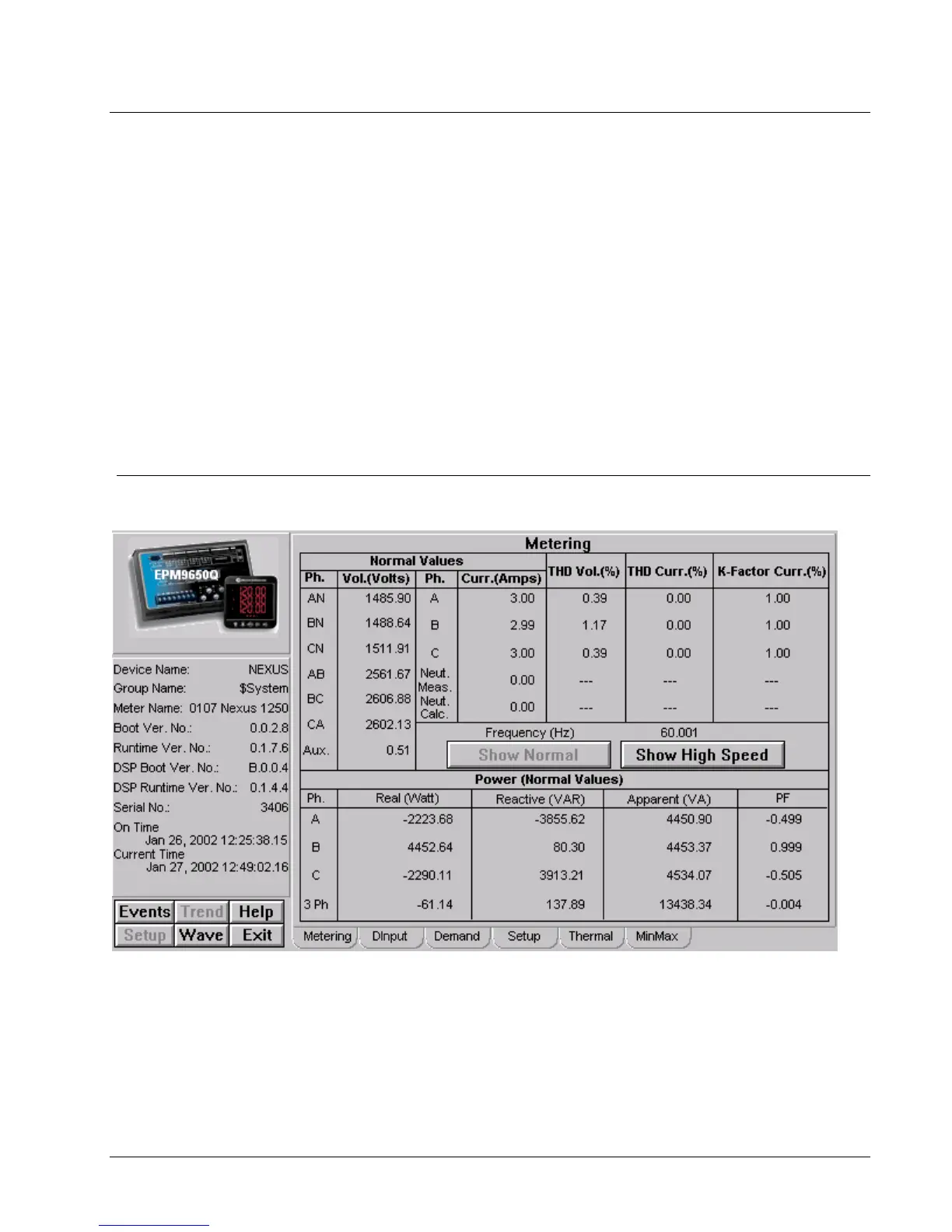 • Power: Displays Phase A, B, C and 3 Phase Power Values for Real (Watt), Reactive (VAR), Apparent (VA) and