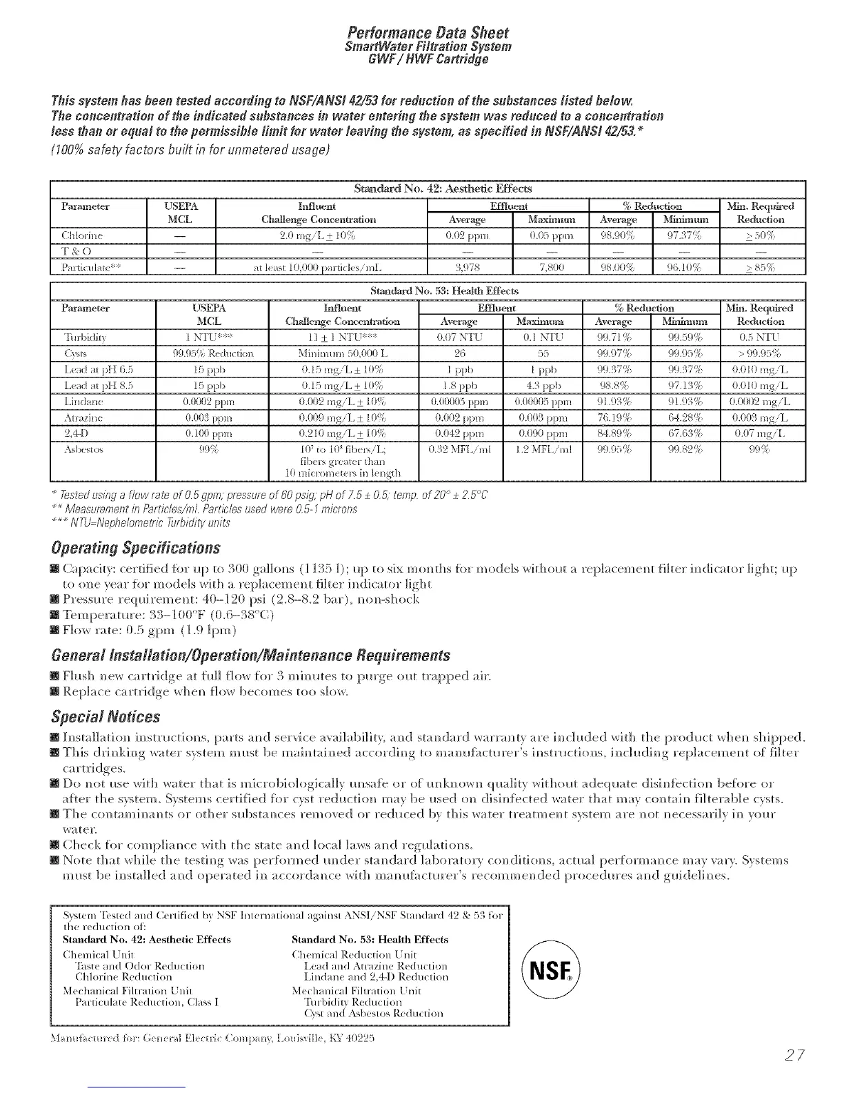 System T(sted and Cerfifi(d b)' NSF Int( rnational agains_ ANSI/'NSF Standard 42 & 53 for