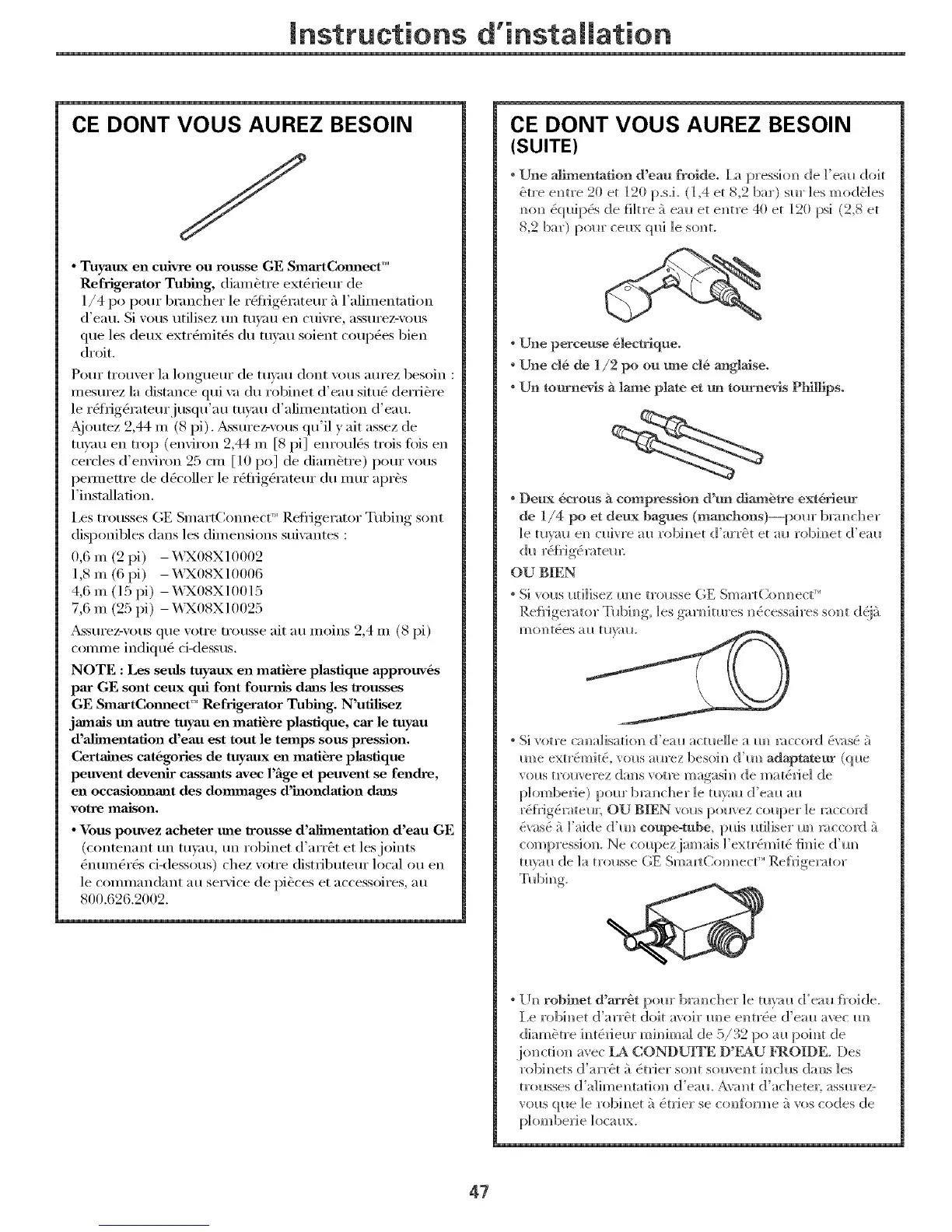 i,es trousses GE SmartConnecV _'ReliJgerator Tubing sont