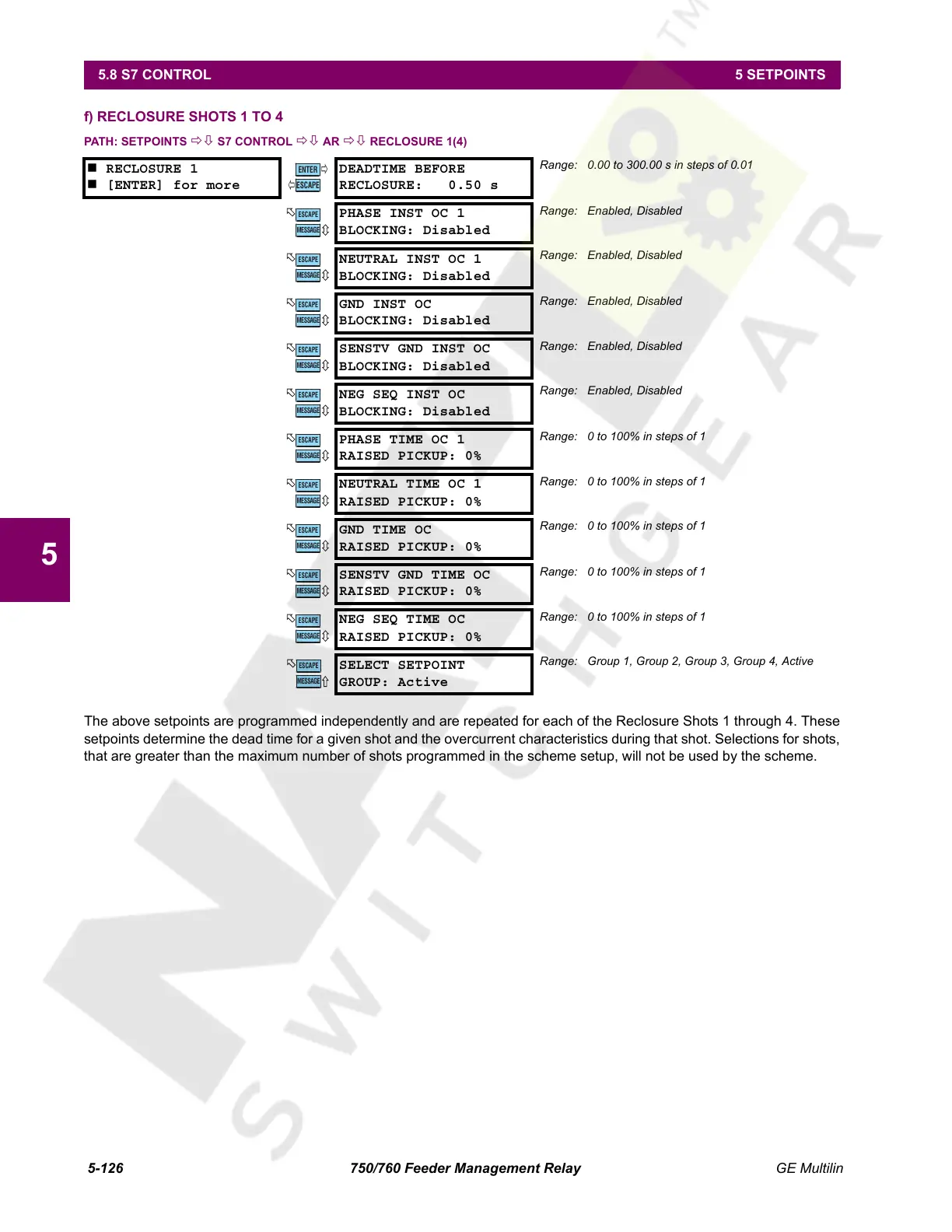 The above setpoints are programmed independently and are repeated for each of the Reclosure Shots 1 through 4. These