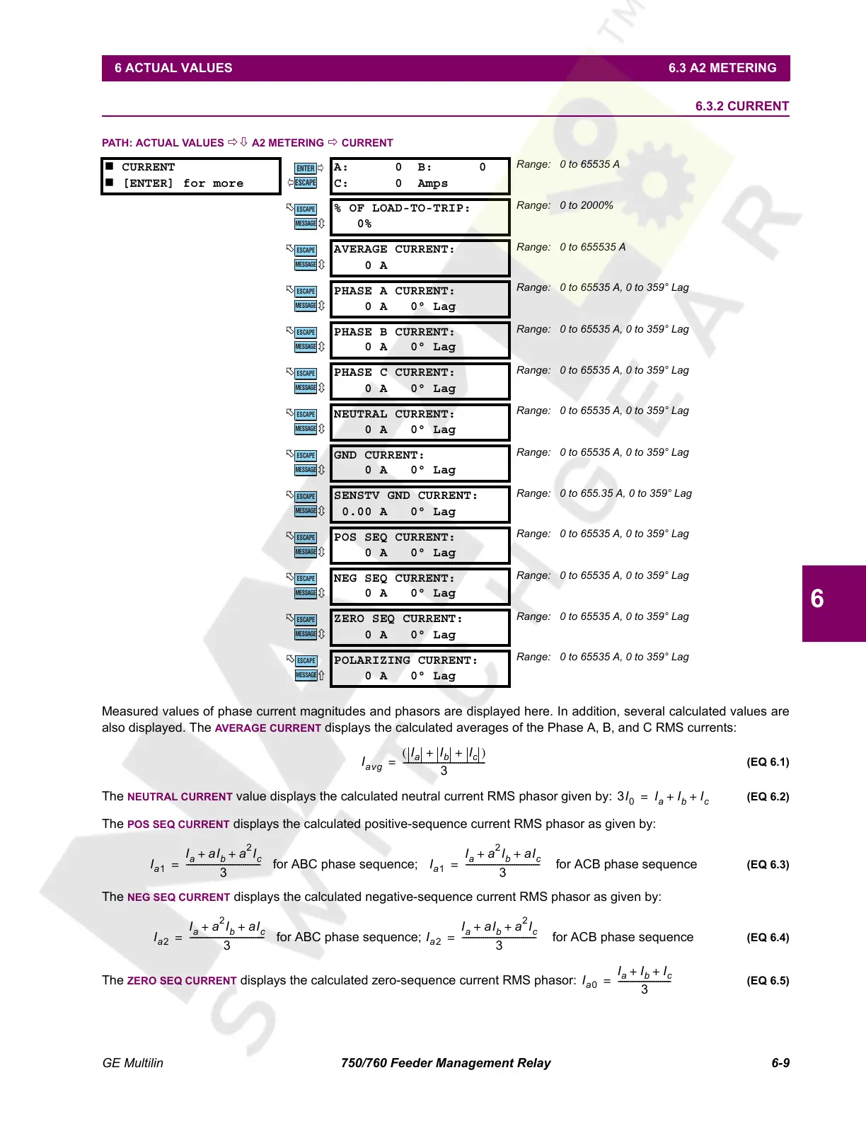 The ZERO SEQ CURRENT displays the calculated zero-sequence current RMS phasor: (EQ 6.5)