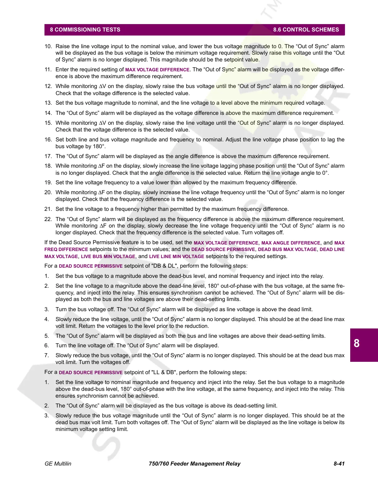 FREQ DIFFERENCE setpoints to the minimum values; and the DEAD SOURCE PERMISSIVE, DEAD BUS MAX VOLTAGE, DEAD LINE