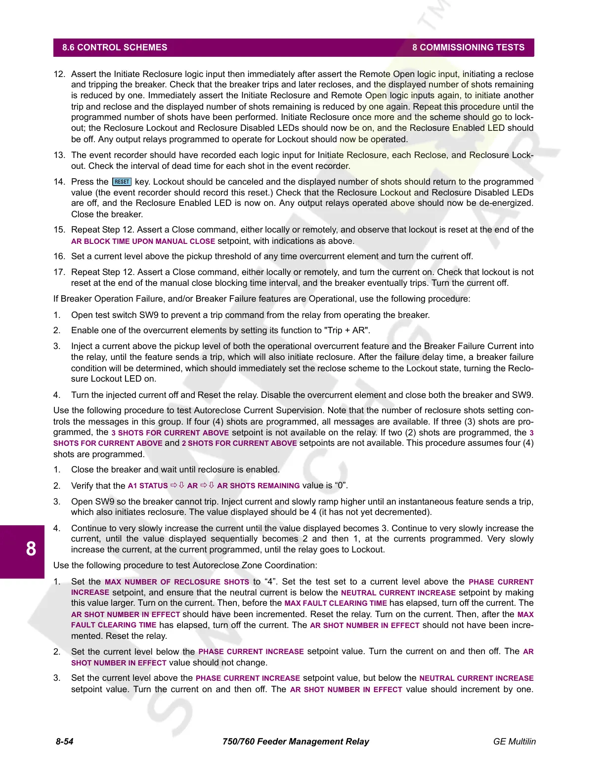 value (the event recorder should record this reset.) Check that the Reclosure Lockout and Reclosure Disabled LEDs