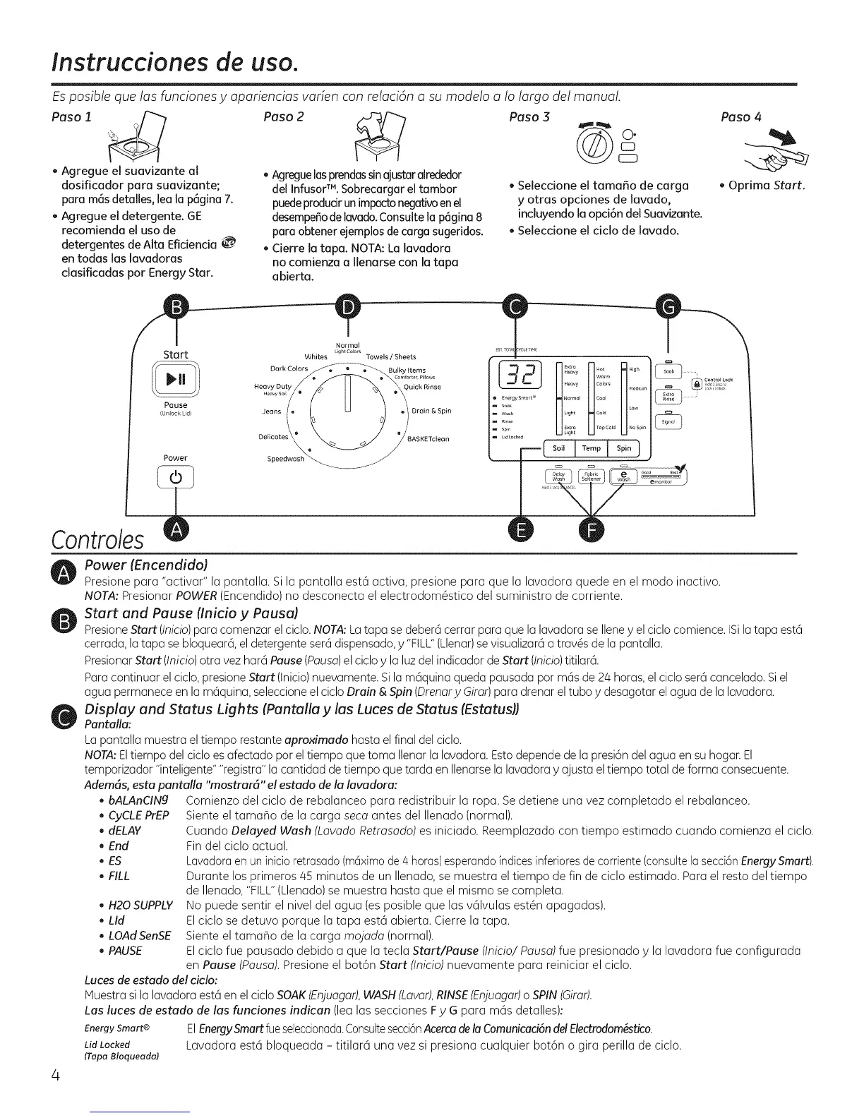 • ES Lavadoraen uninicio retrasado(m6ximode4 horas)esperandoindicesinferioresde corriente (consuttela secci6nEnergy Smart).