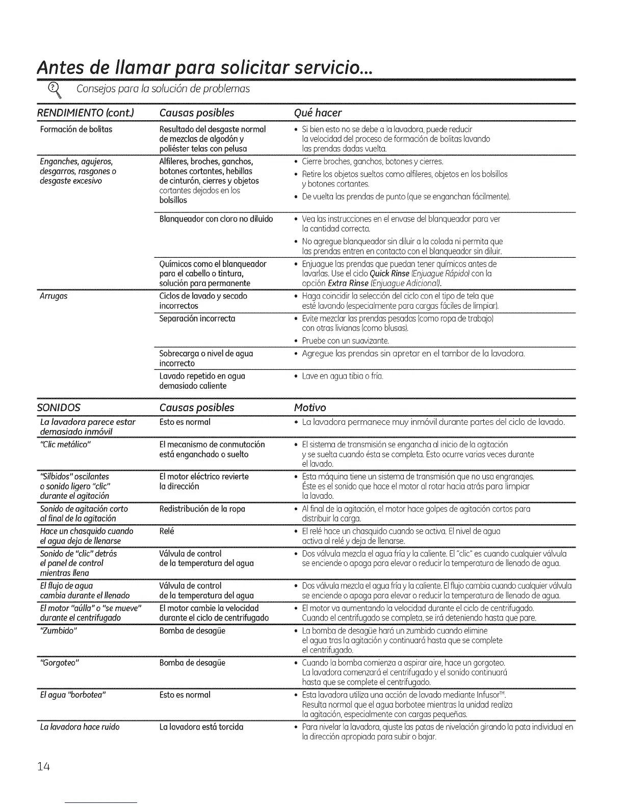 La lavadora parece astor Esto es normal • La lavadora permanece muy inm6vil durante partes del ciclo de lavado.
