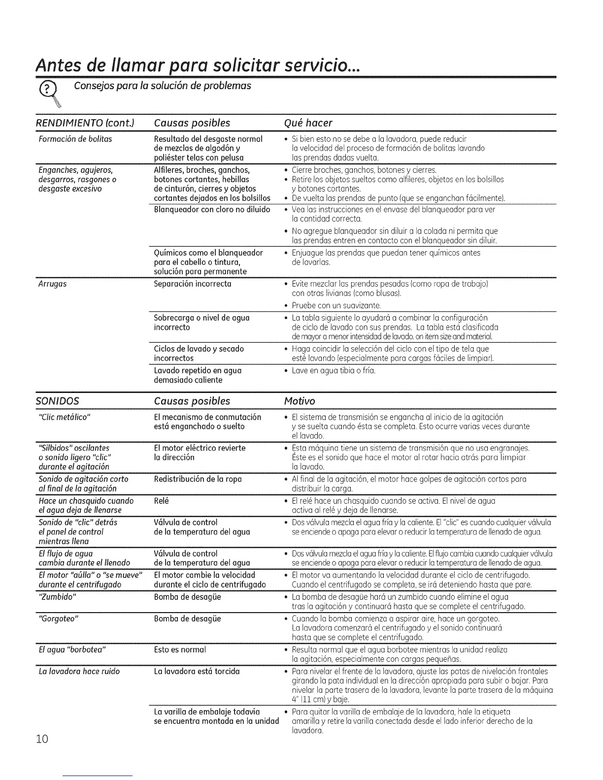 Lalavadora haceruido La lavadora est8 torcida • Paranivelar el frente de la lavadora,ajuste los patas de nivelaci6nfrontales