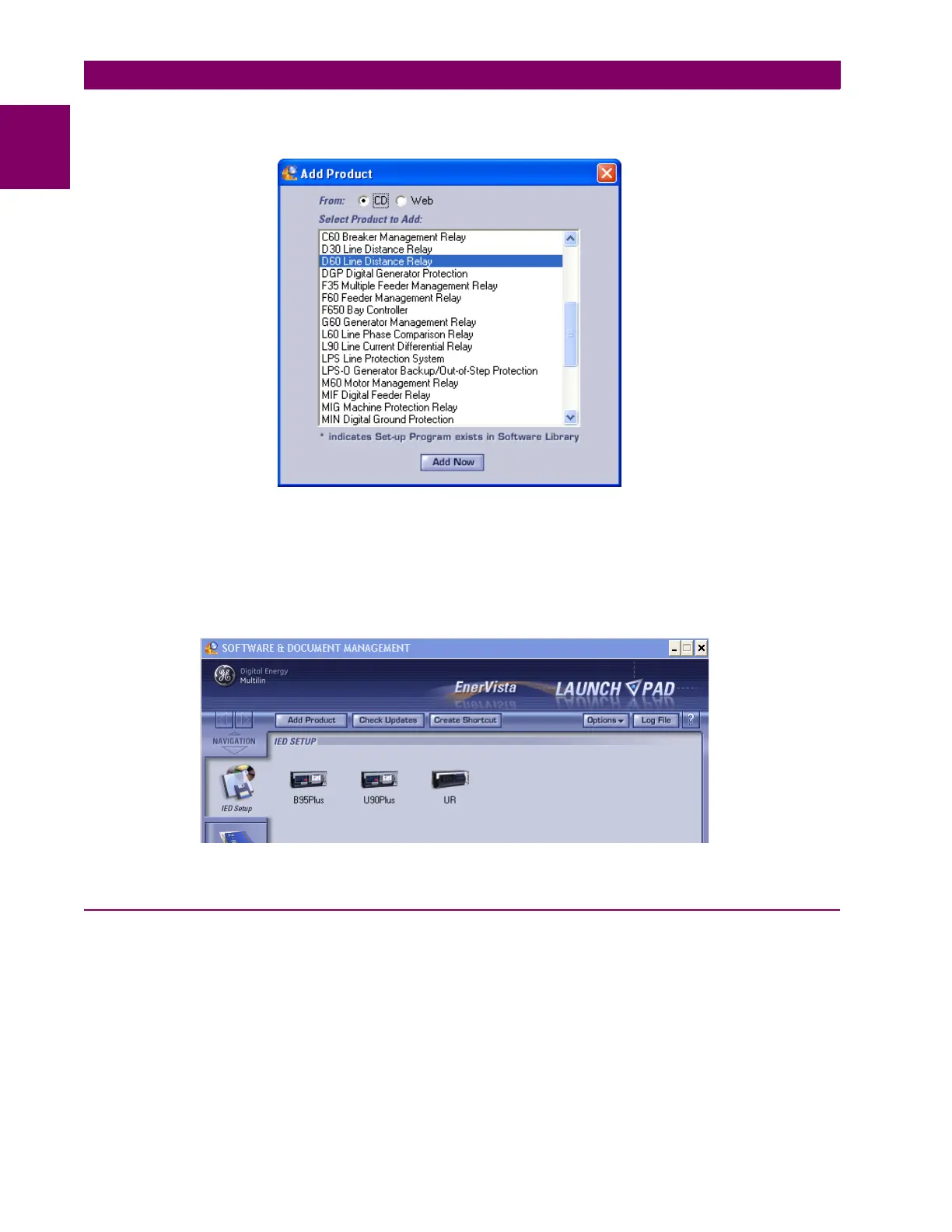 tion, then click the Add Now button to list software items for the product. EnerVista Launchpad obtains the software