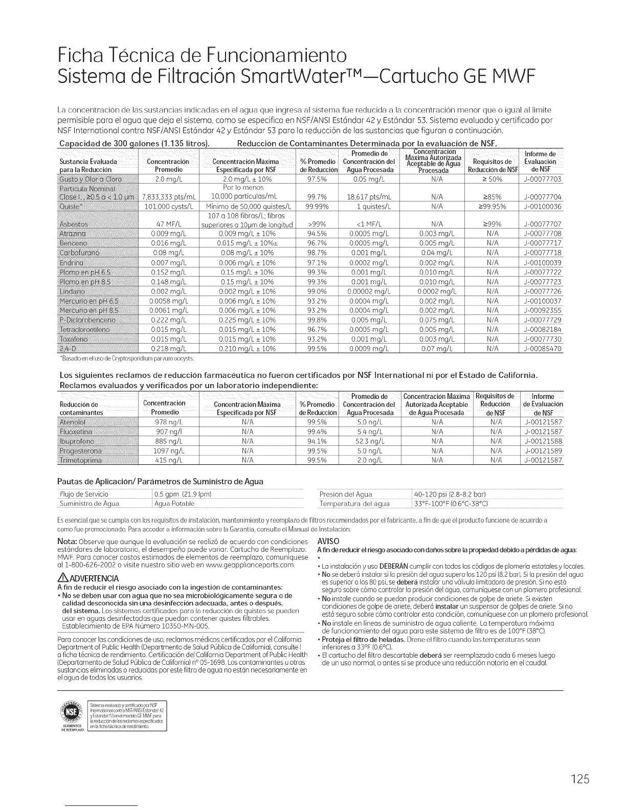NSF International contra NSF/ANSI EstOndar 42 y EstOndar 53 pare la reducci6n de las sustancias qua figuran a continuaci6n.