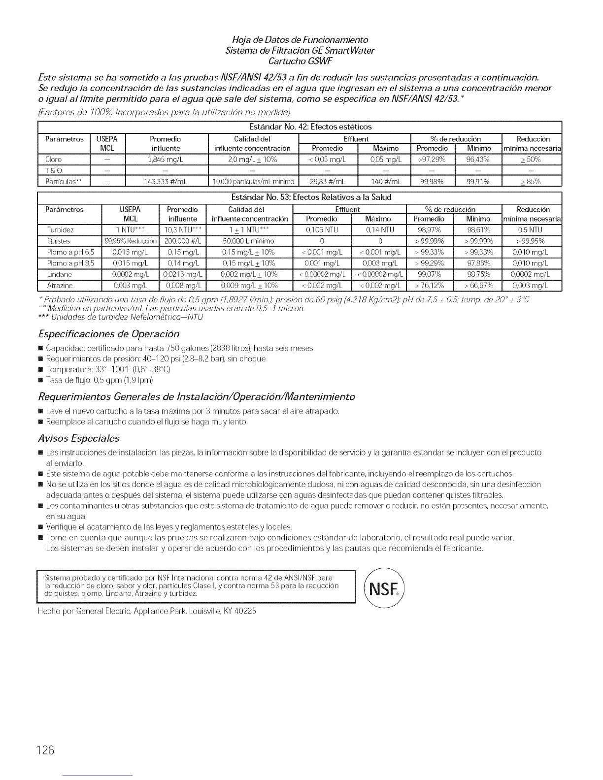 Probado utilizando una tasa de flUjO de 0,5 gpm (1,8927 I/m#7,); presion de 60 psig (4,218 Kg/cm2); pH de Z5 + 0,5; temp. de 20 ° + 3°C