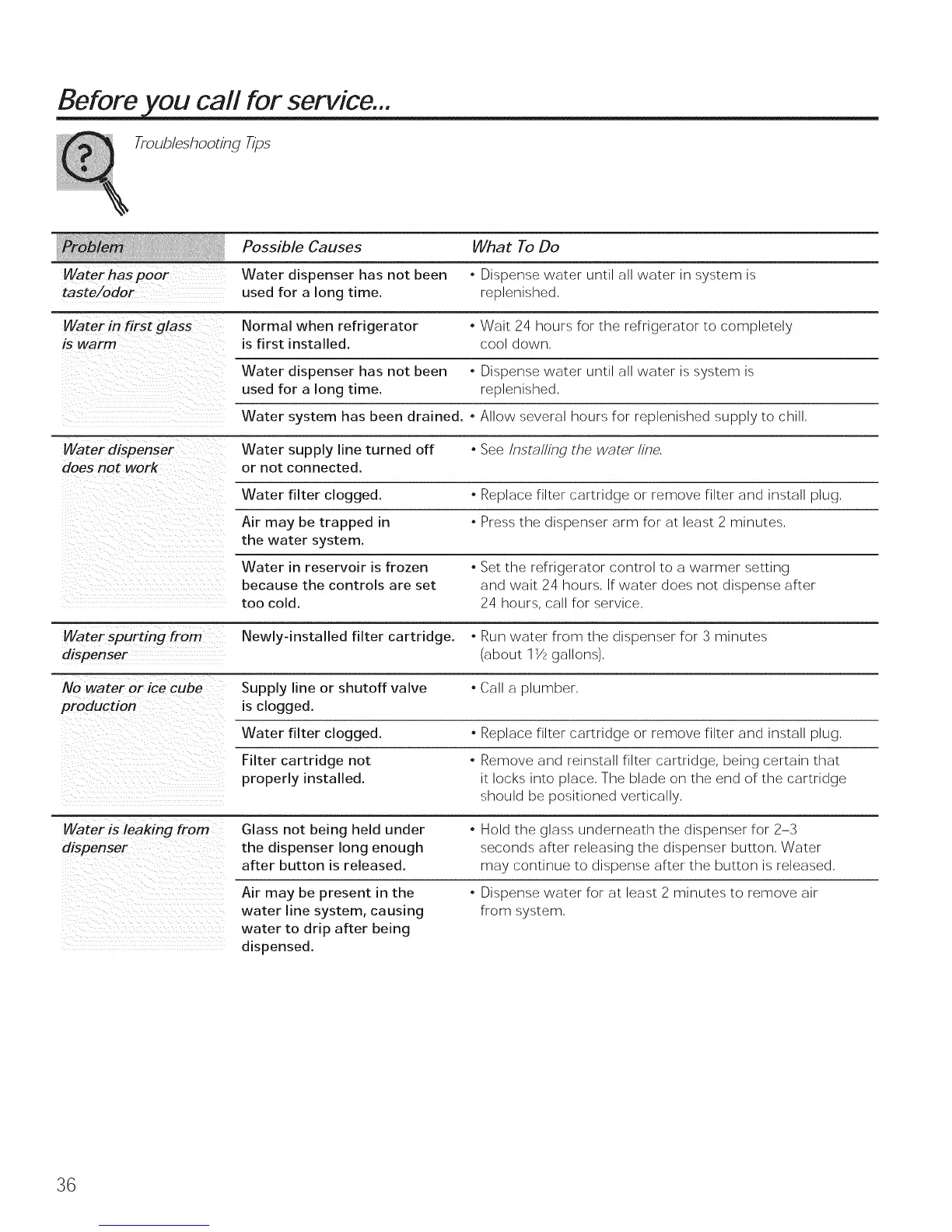 Water has poor Water dispenser has not been , Dispense water until all water in system is