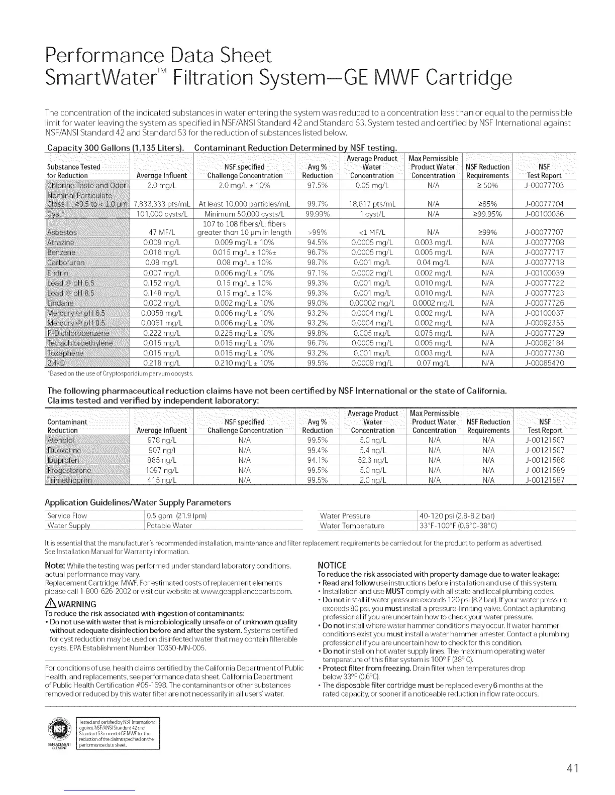 limit for water leaving the system as specified in NSF/ANSI Standard 42 and Standard 53, System tested and certified by NSF International against