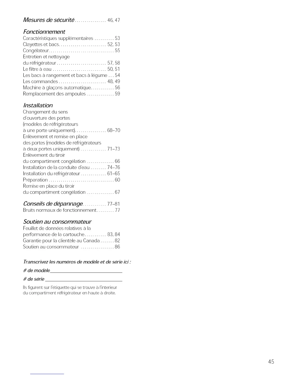 Installation du reffig6rateur ............. 61-65