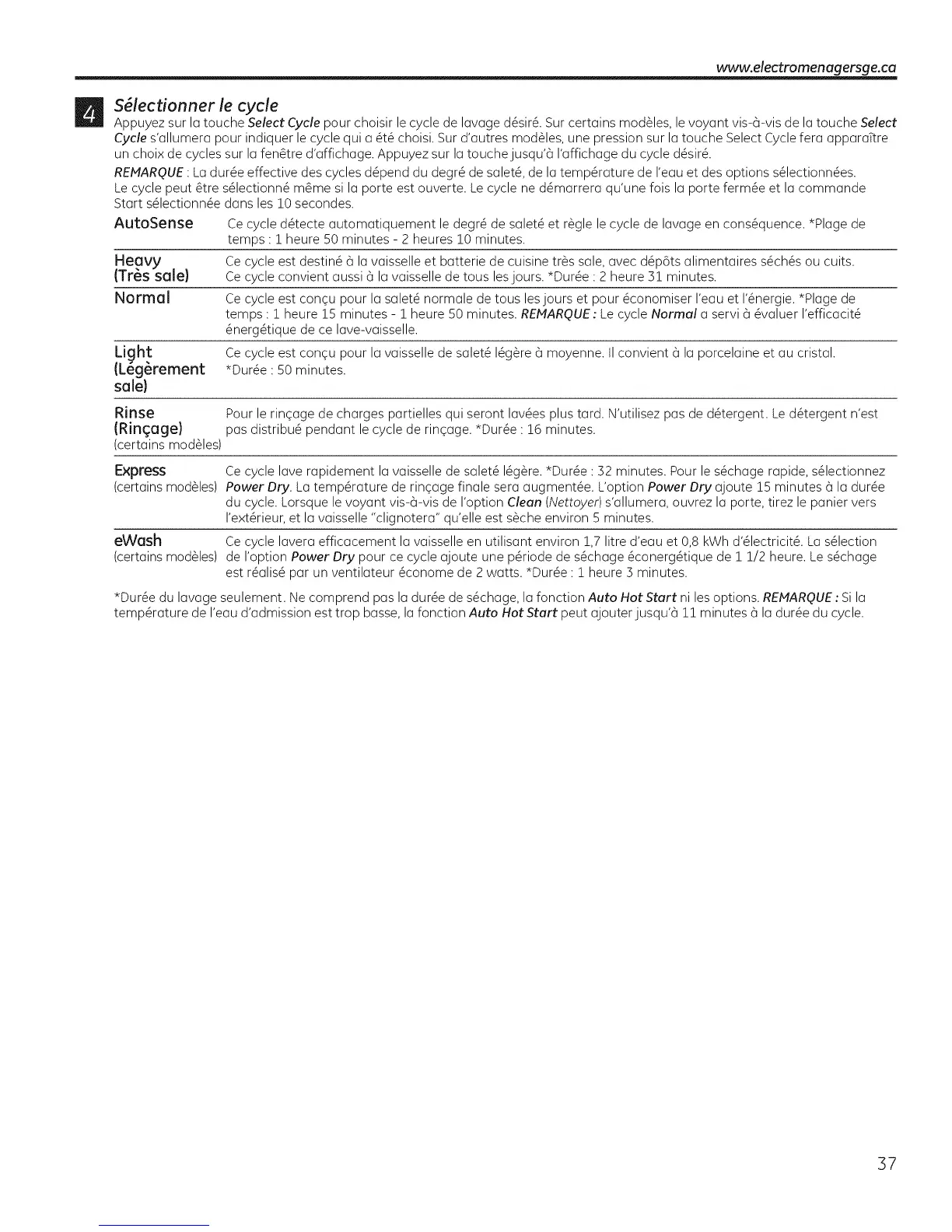 REMAROUE: La dur6e effective des cycles d6pend du degr6 de salet6, de la temp6rature de reau et des options s61ectionn6es.