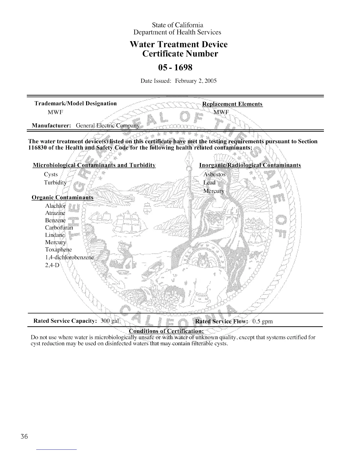Rated Service Capacity: 300 gal ; ; _tedSer{ice Flow: 0.5 gpm