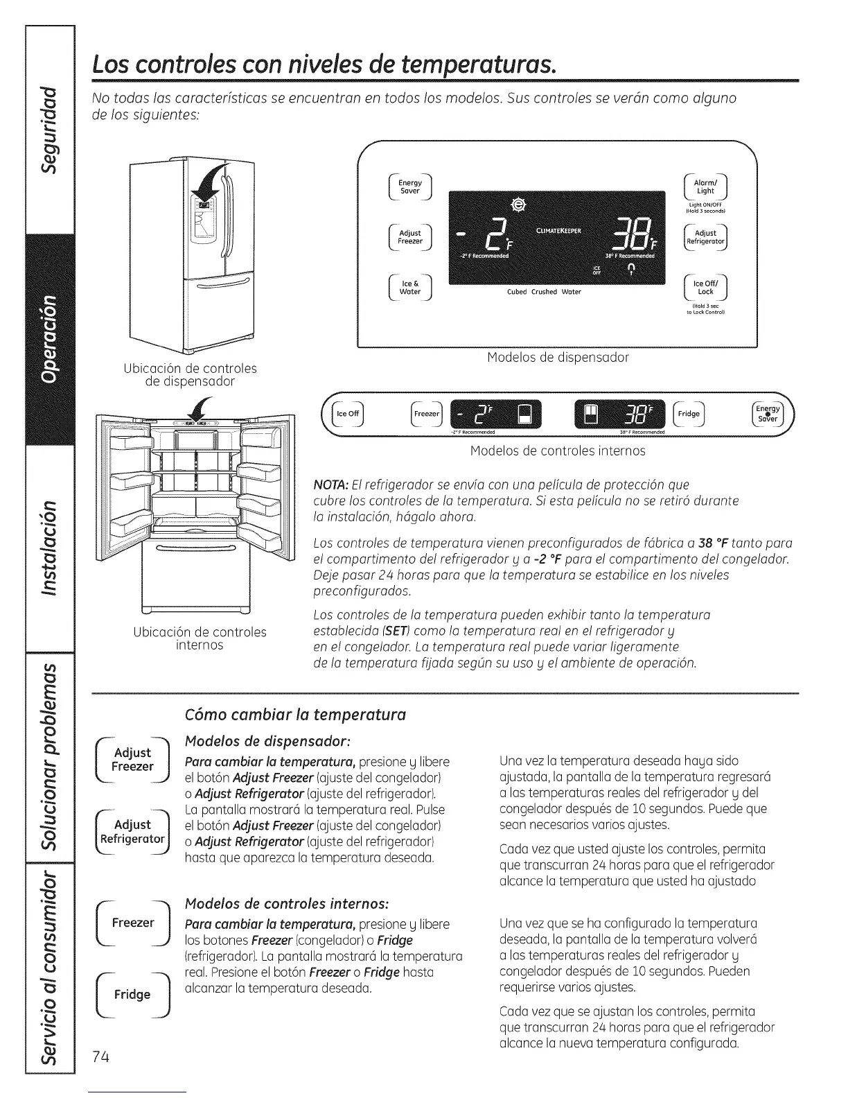 Los contmles de temperatura vienen preconfigurados de fdbrica a 38 °F tanto para