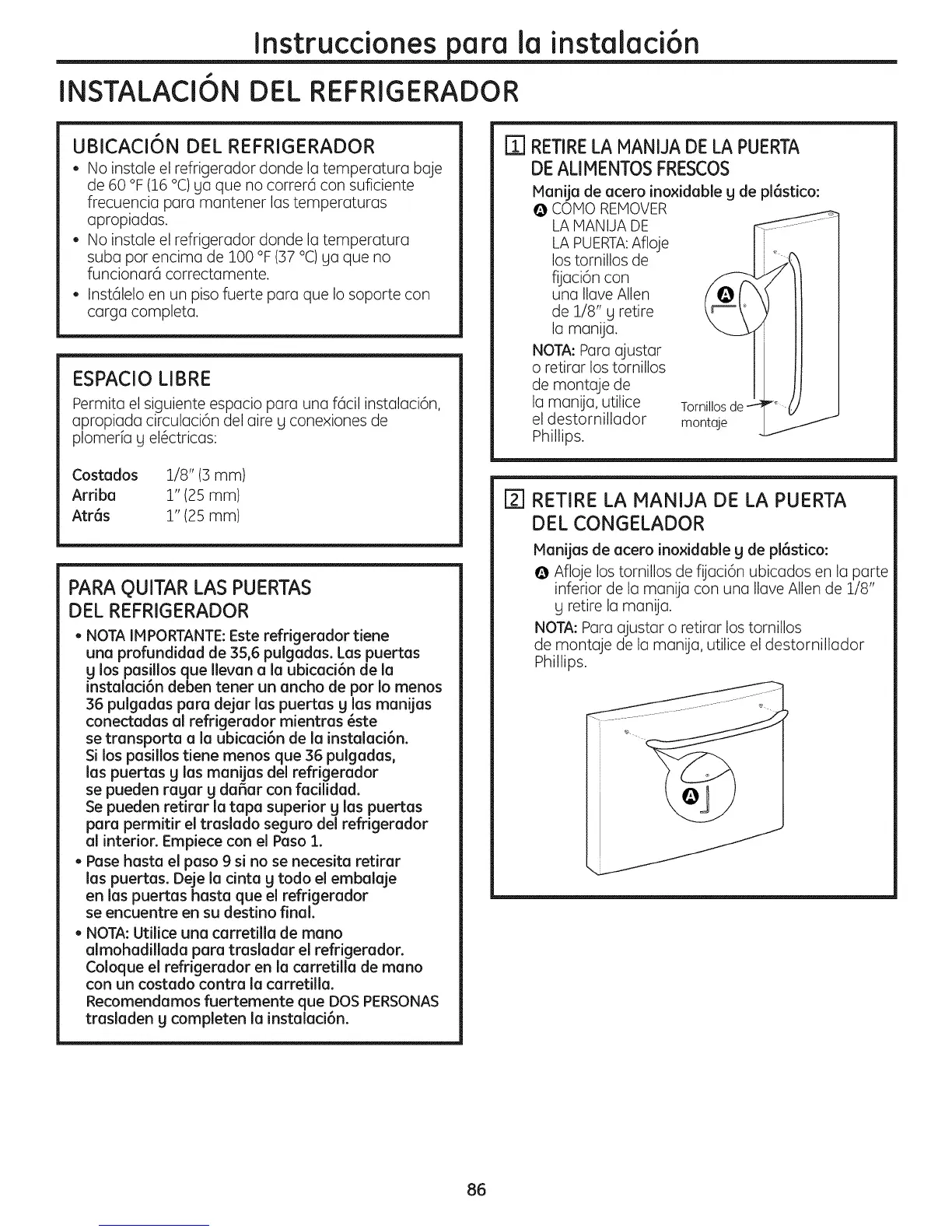 36 pulgadas para dejar las puertas g las manijas