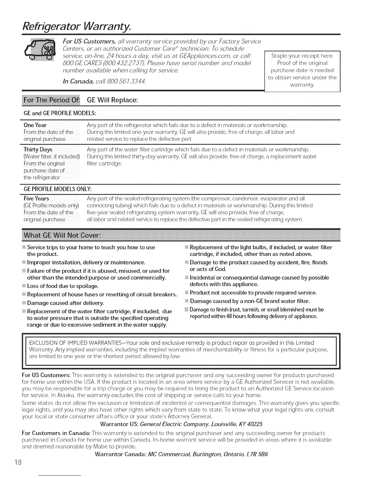 Warrantor US: General Electric Company. Louisville, KF 40225