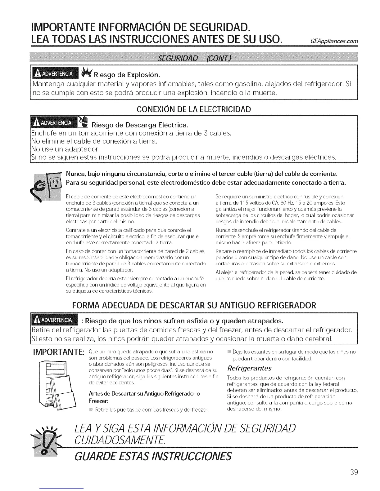 Para su seguridad personal, este electrodomestico debe estar adecuadamente conectado a tierra.