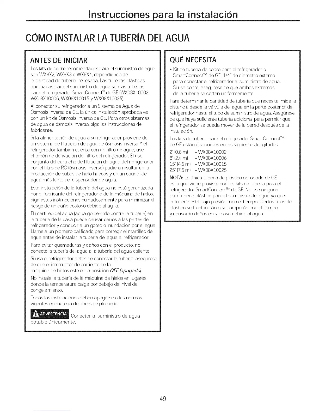refrigerador hasta el tubo de suministro de agua, Asegurese