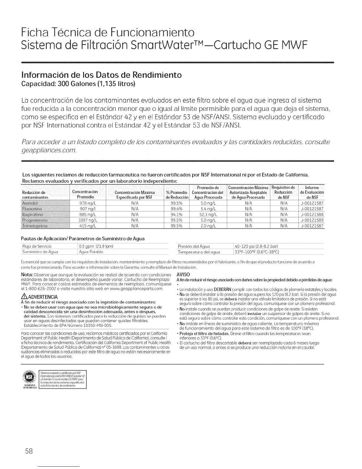 como se especificu en el Est6ndur 42 y en el Est6ndur 53 de NSF/ANSI. Sistemu evuluudo y certificudo