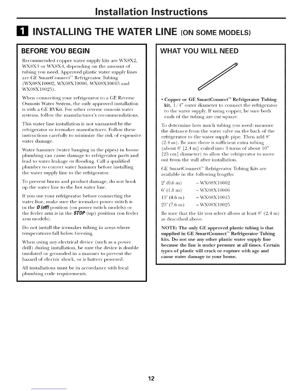 supplied in GE SmaxtCormect'" Refrigerator Tubing